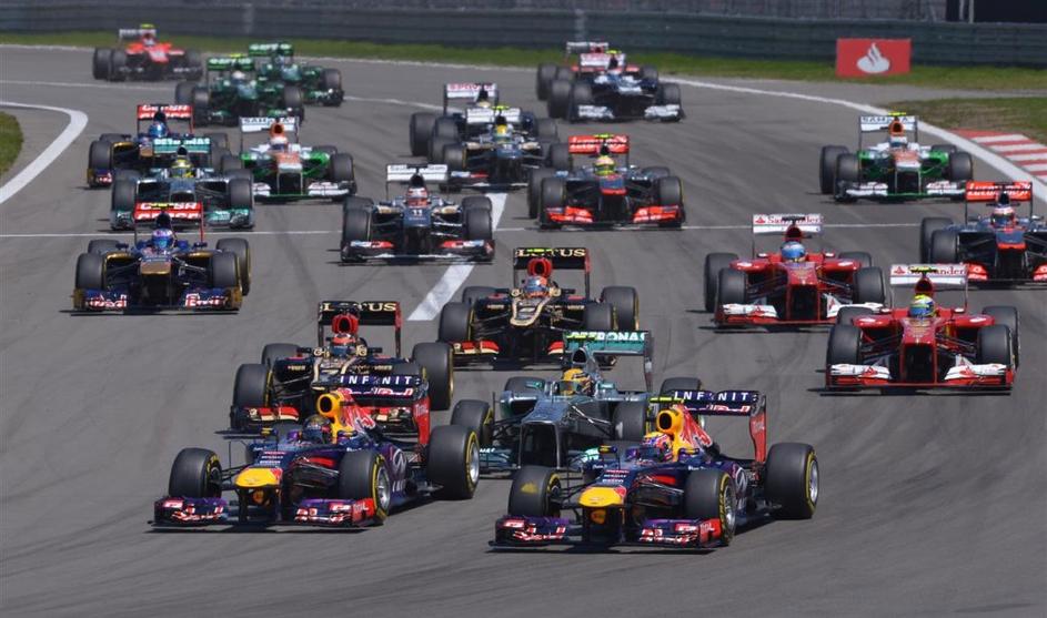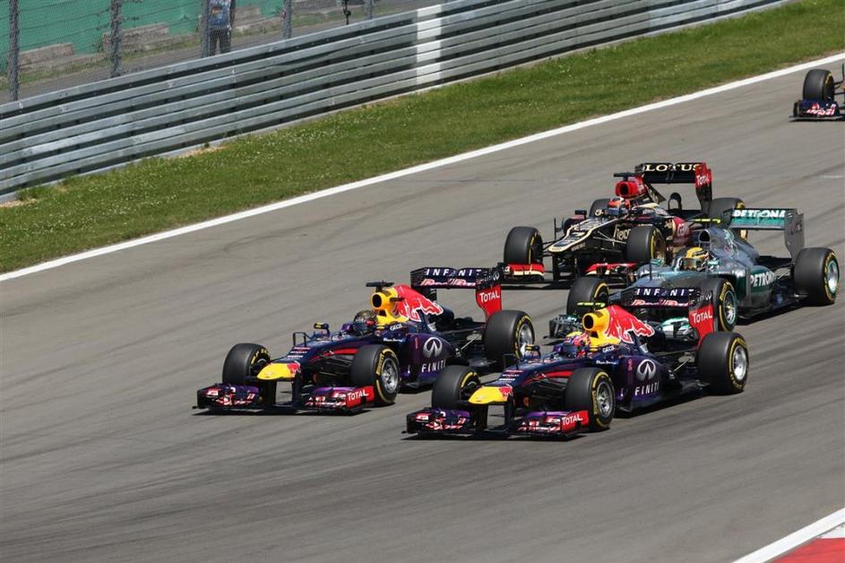 Utrinki z dirke v Nürburgringu. Red Bulla sta že od začetka držala previsok ritem za zasledovalce.