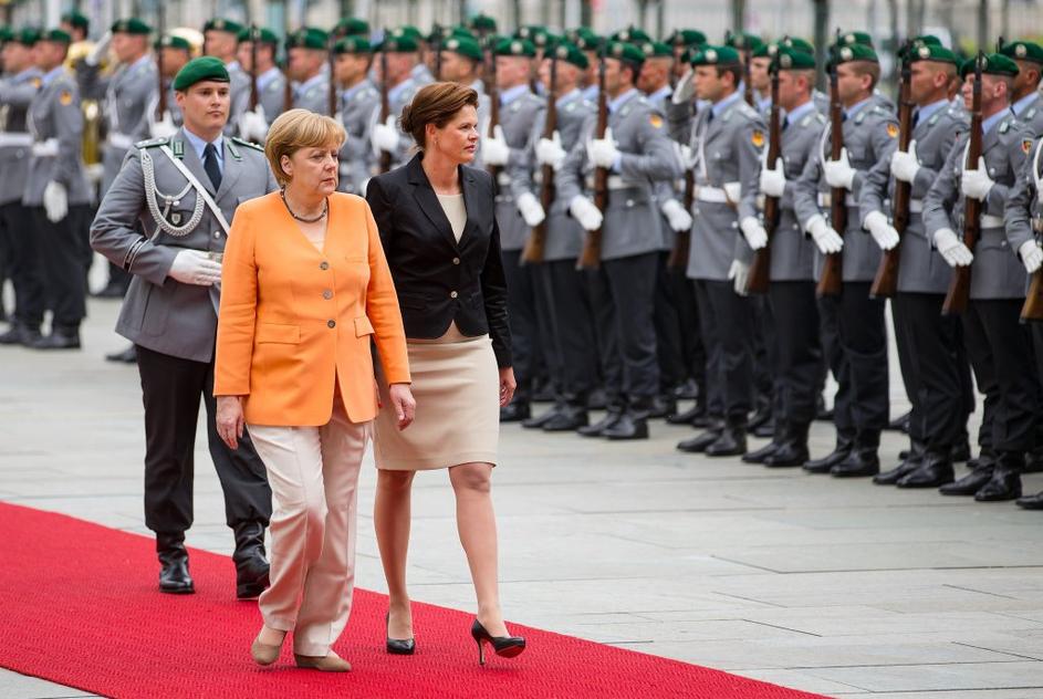 Merklova v nizkih, vsakdanjih čevljih, Bratuškova v črnih salonarjih.
