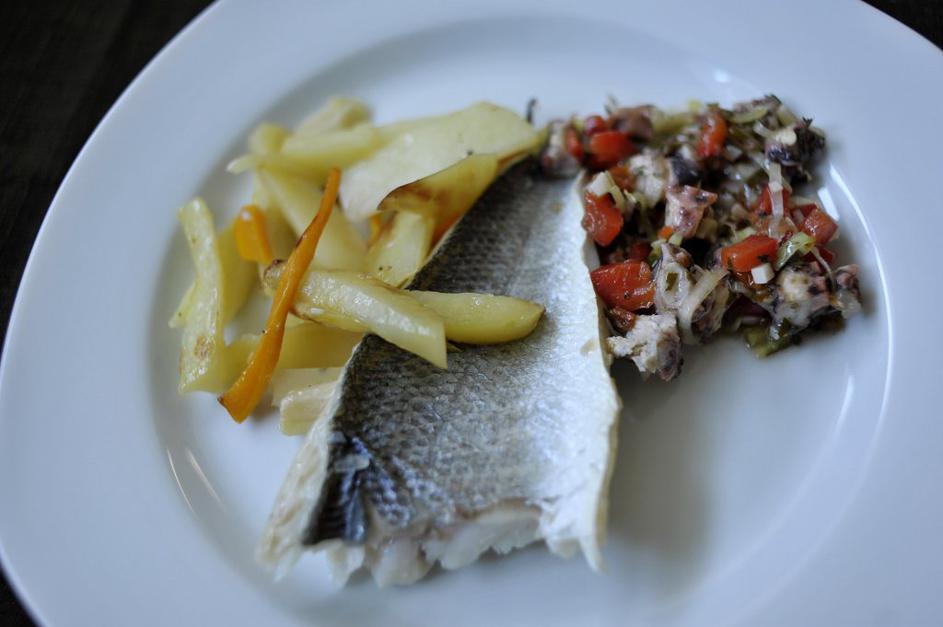 Brancin s pisano zelenjavo in pečenim krompirjem.