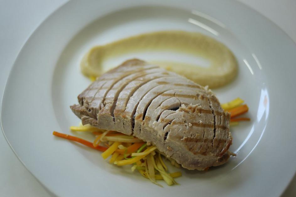 Tunin steak na koromačevem pireju z julienne zelenjavo.