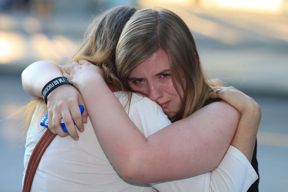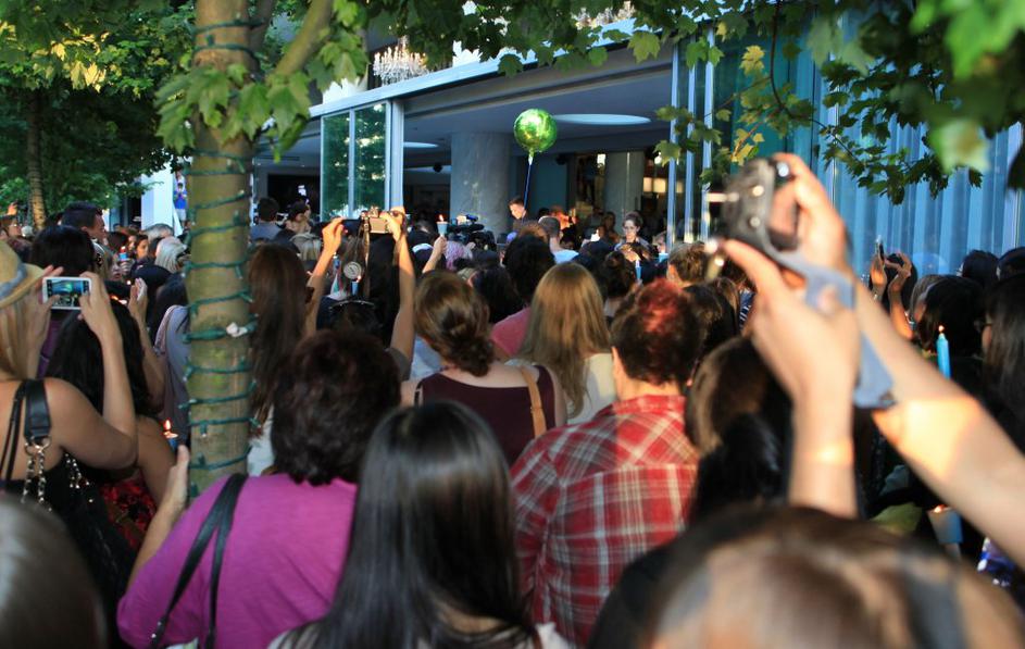 Oboževalci se od zvezdnika poslavljajo pred hotelom.