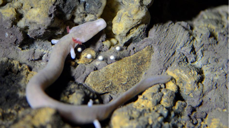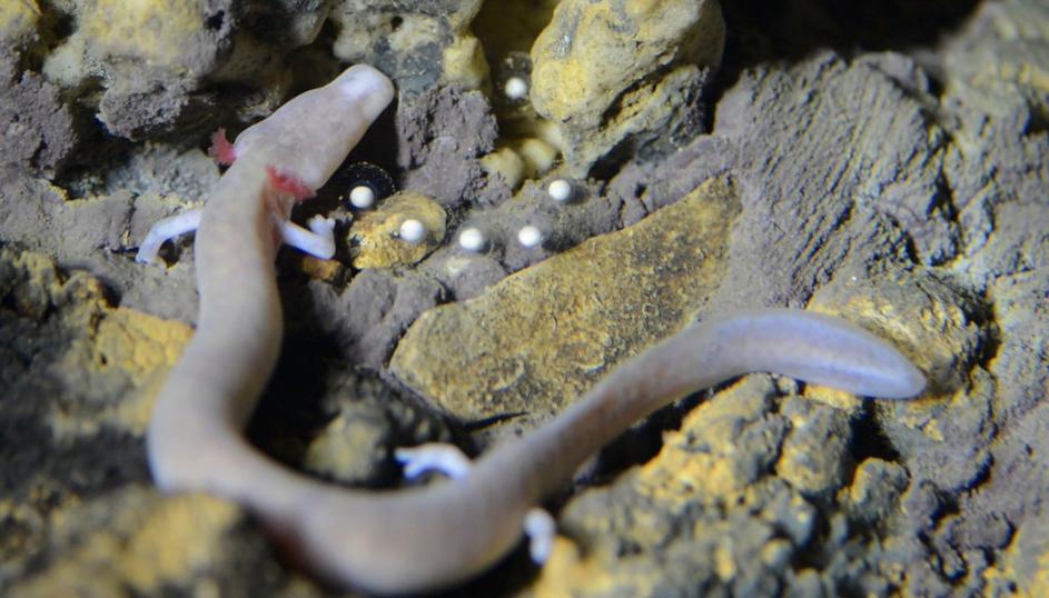 človeška ribica3Predvidevajo, da se samica zadržuje ob jajčecih tako dolgo, dokler se po treh do štirih mesecih iz jajc ne izležejo do 2 cm velike ličinke. postojnska jama, ciril mlinar