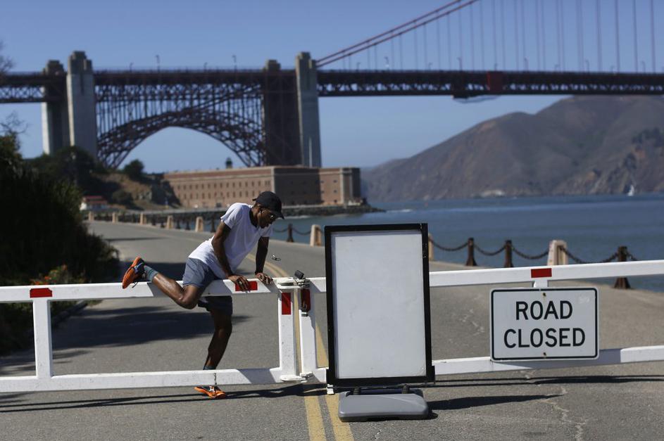 Posledice finančne blokadeTekač pleza čez cestno zaporo, ki vodi do zgodovinske utrdbe Fort Point, ki je na južni strani znamenitega mostu Golden Gate v San Franciscu. Reuters