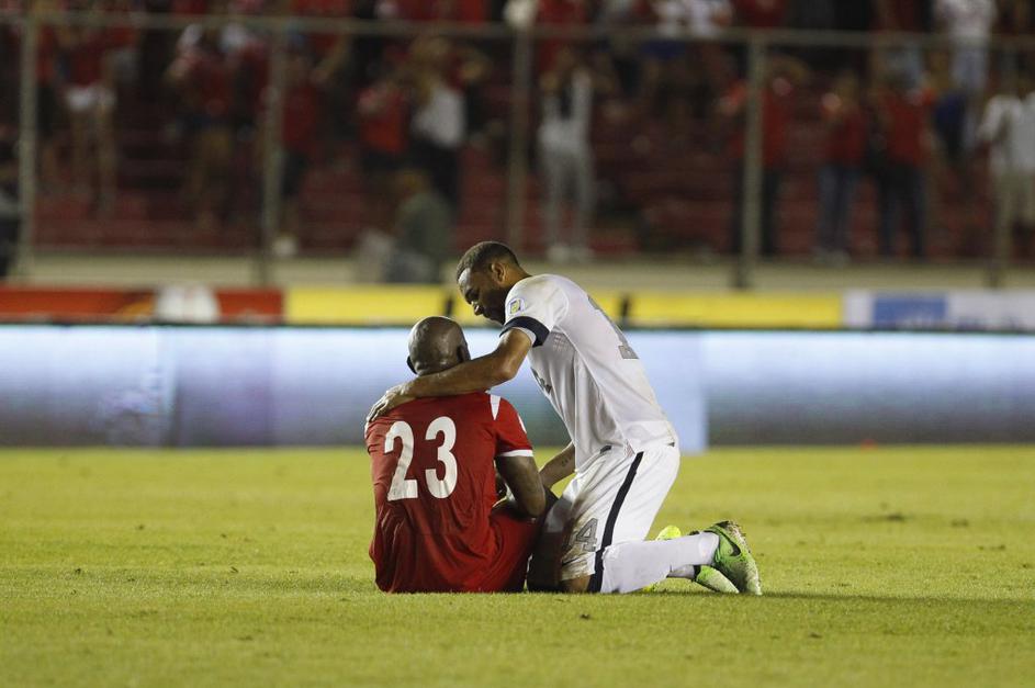 Takole je Američan Aron Johannsson tolažil domačina Alberta Quintera po koncu tekme v Panama Cityju (Panama - ZDA).