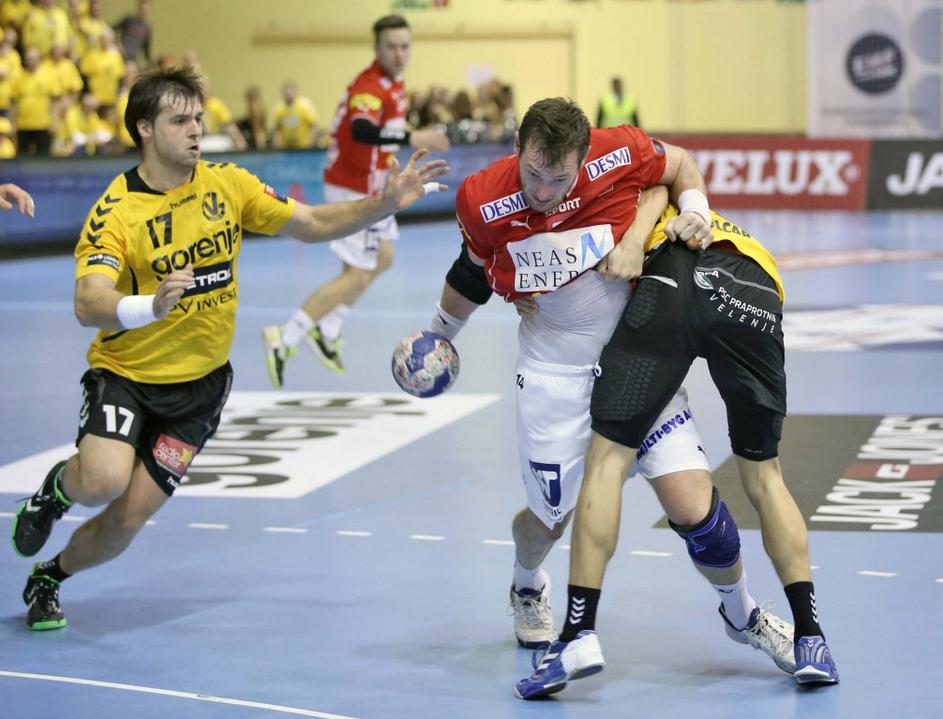 (Gorenje Velenje - Aalborg) liga prvakov (Gorenje Velenje - Aalborg) Luka Dobelšek (levo) ni premagal gostujočega vratarja. Gregor Katič (Gorenje Velenje - Aalborg) liga prvakov