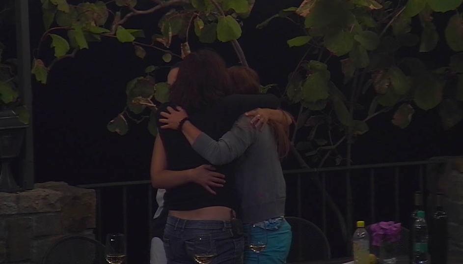 Rahlo vinjena dekleta se objemajo.