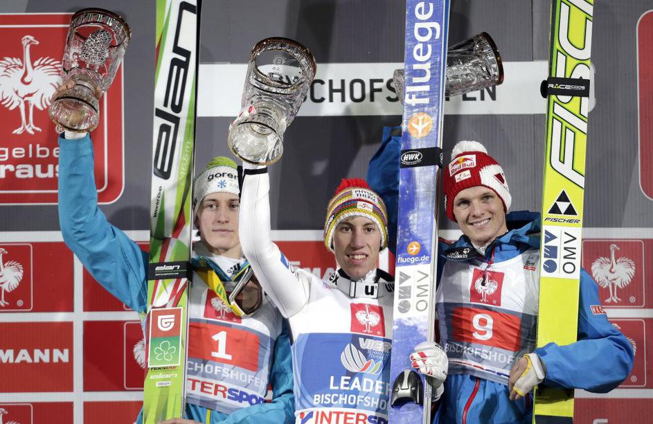 Prevc Diethart Morgenstern BischofshofenPrvi trije na zadnji tekmi Novoletne turneje 2013/14. Iz leve: drugi Peter Prevc, zmagovalec Thomas Diethart in tretji Thomas Morgenstern. EPA