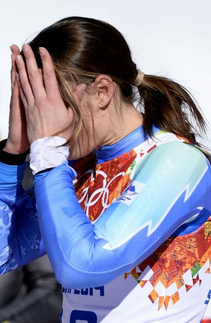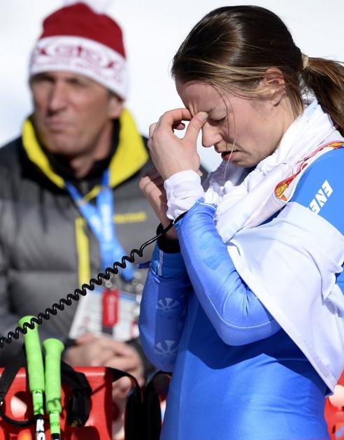 Mazejeva v cilju na Krasnaji Poljani.