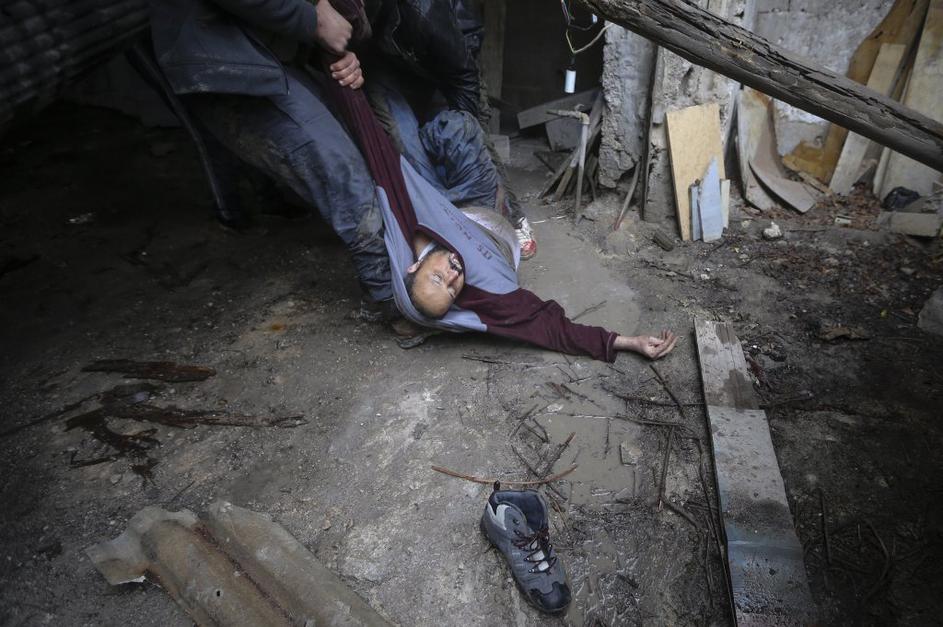 Ranjenega vodjo poskuša kolega odvleči na varno pred streli ostrostrelcev.
