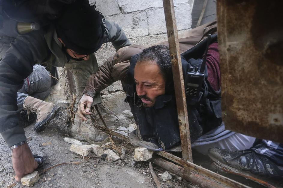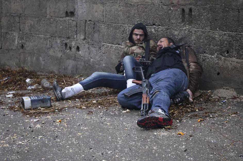 V zid, pred katerim stojijo, prileti izstrelek režimske vojske.