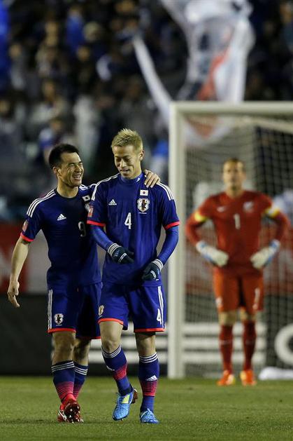Okazaki Honda Japonska Nova Zelandija prijateljska tekma Tokio(Japonska – Nova Zelandija) Japonci so že v prvem polčasu povsem potolkli Novozelandce, med strelce sta se vpisala tako Keisuke Honda (desno), soigralec Valterja Birse v Milanu, kot Šindži Okazaki (levo). EPA