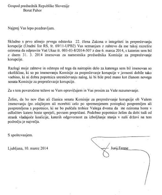 Odstopna izjava Jurija Fermeta.