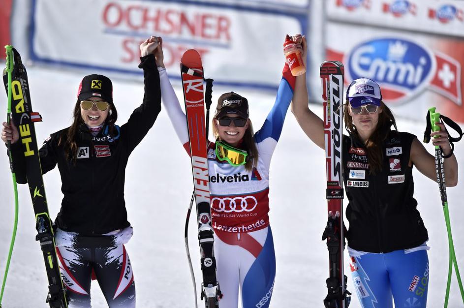 Zmagovalke (z leve proti desni): Anna Fenninger, Lara Gut in Tina Maze.