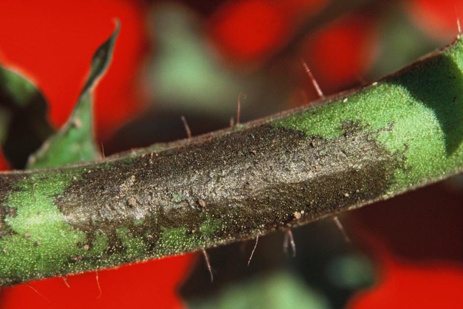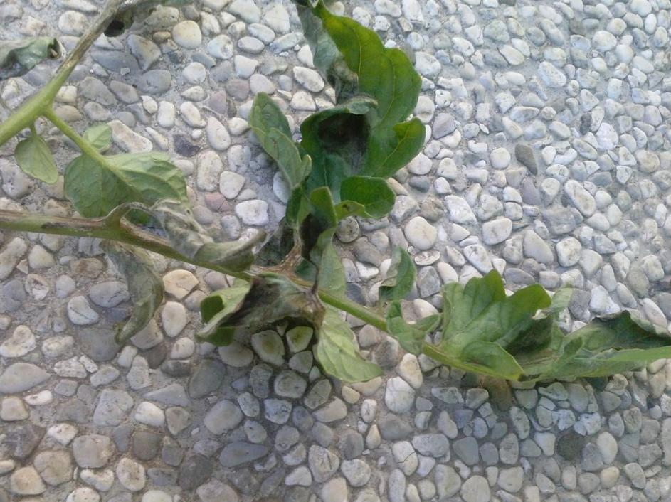 Plesen paradižnikaNa steblu se pojavljajo temne pege elipsaste oblike, na zelenih plodovih pa opazimo temnejše vdrte pege. Klub Gaia
