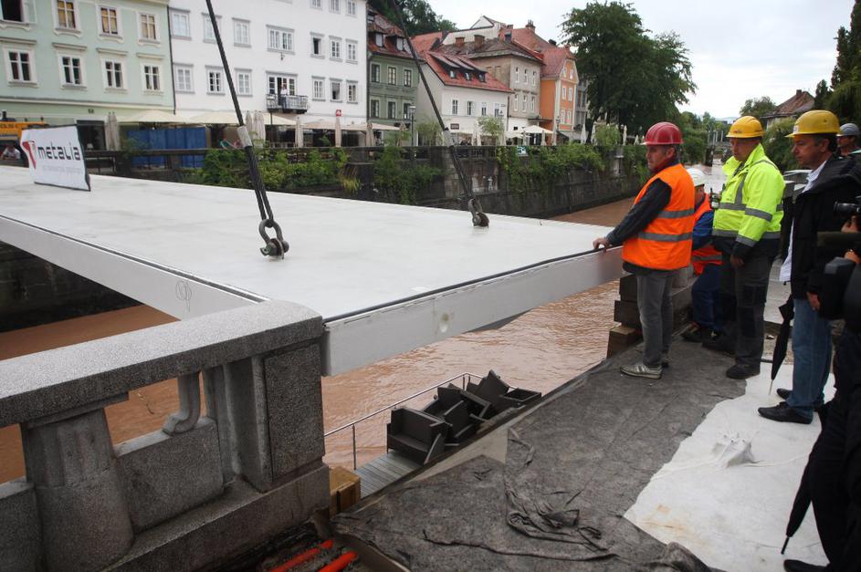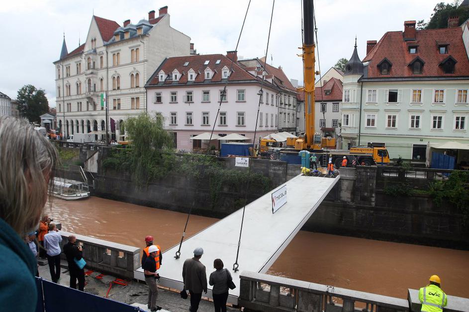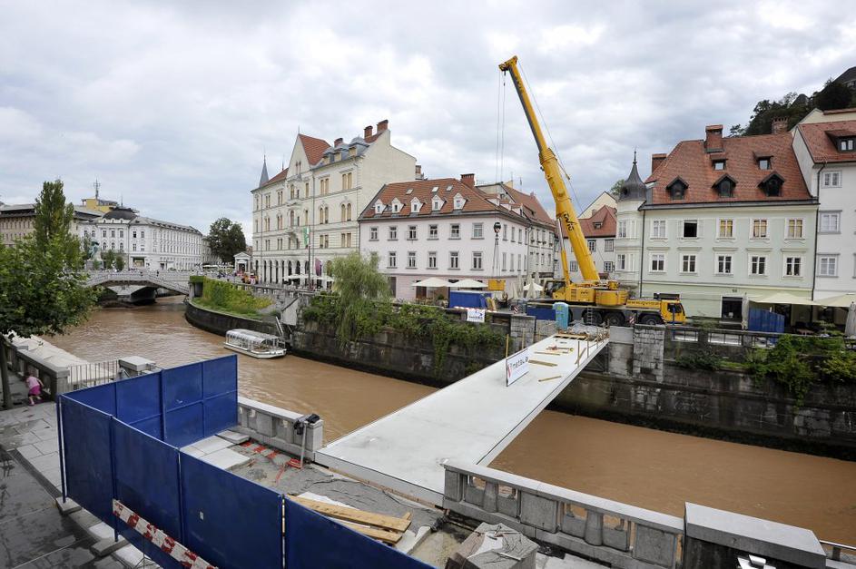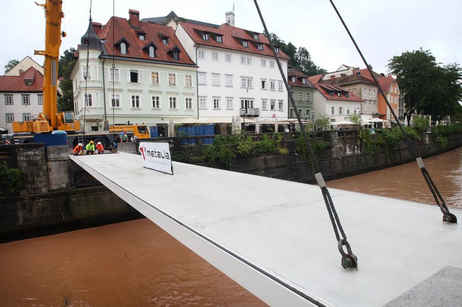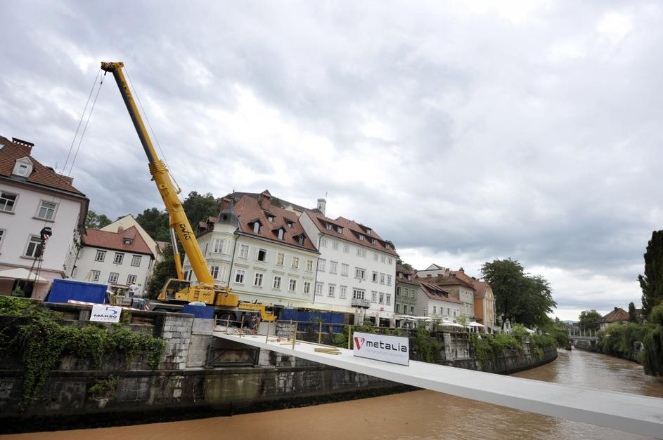 Montaža železne konstrukcije za novo Ribjo brv v Ljubljani