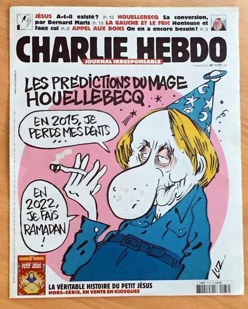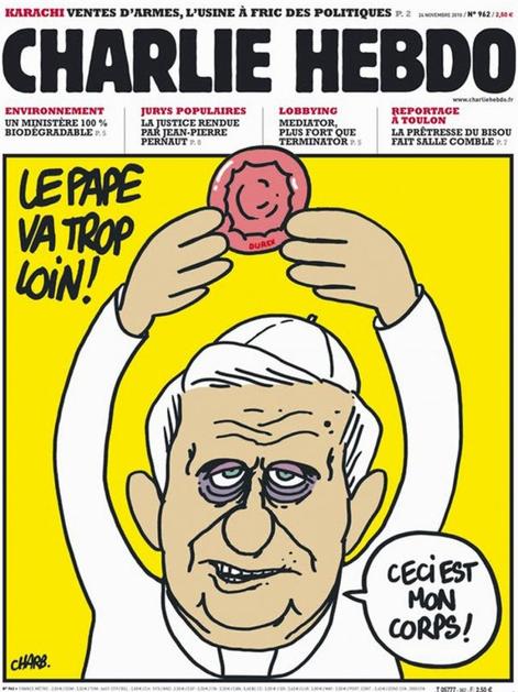 Naslovnica satiričnega tednika Charlie HebdoNa eni od naslovnic so upodobili papeža Benedicta XVI, ki v zraku drži kondom med bogoslužjem in nagovarja vernike. "To je moje telo!" Naslovnica je nastala po seriji nasprotujočih izjav zdaj že nekdanjega papeža o tem, v kakšnih okoliščinah bi katoliška Cerkev odobravala spolne odnose z uporabo kon Profimedia
