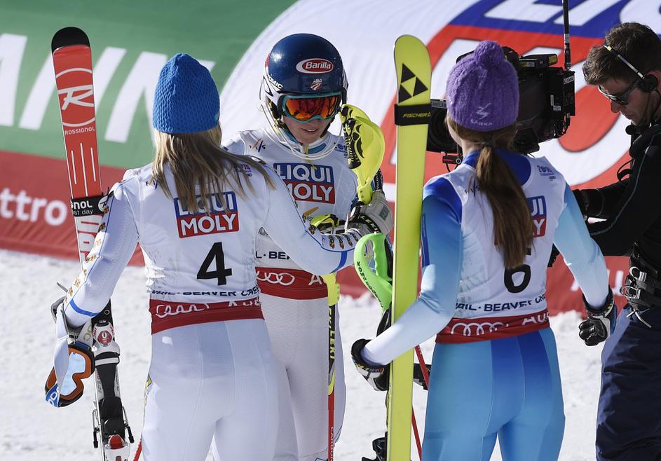Frida Hansdotter (levo), Mikaela Shiffrin (sredina) in Šarka Strachova.