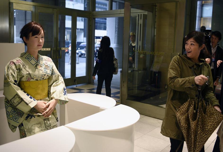 Japonski robotRobot se zaenkrat ne odziva na vprašanja ali pritožbe strank, ampak stranke usmerja po veleblagovnici z vnaprej pripravljenim govorom. EPA