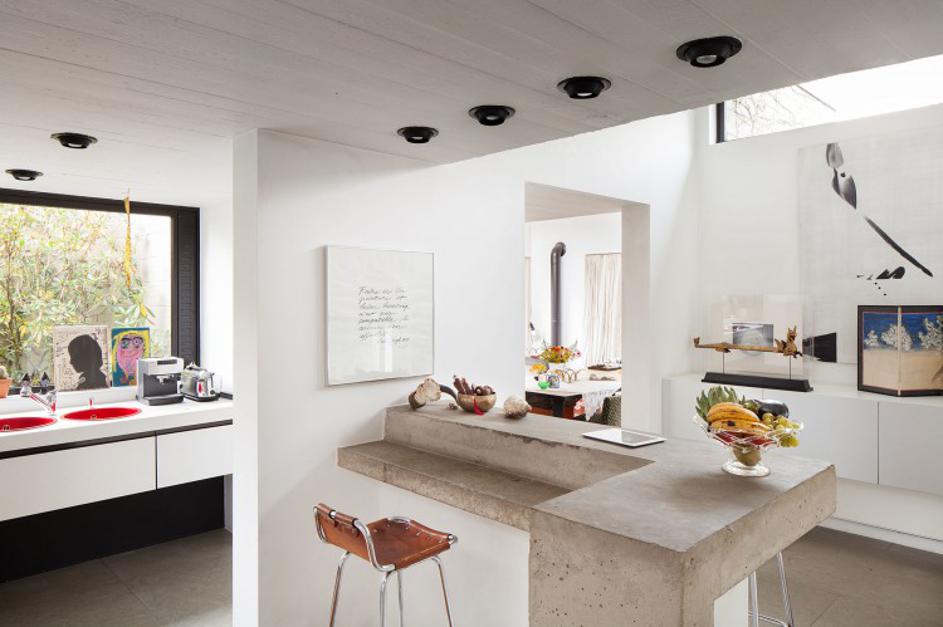 vandemoorteleDom zdaj izgleda lahkoten in svetel. Lastnica je brutalistične elemente vidnega betona in kovinskih okenskih okvirjev spretno uravnovesila s pastelnimi barvnimi poudarki. Žurnal24