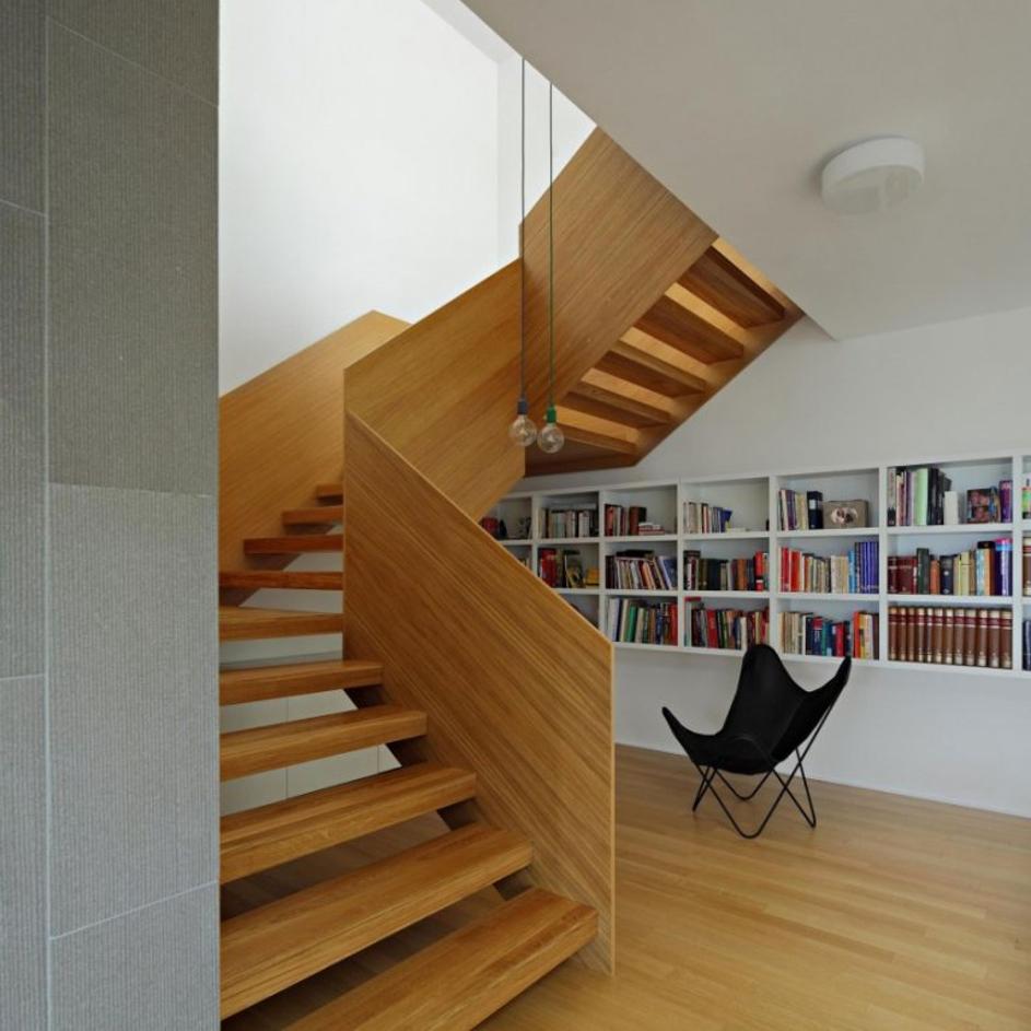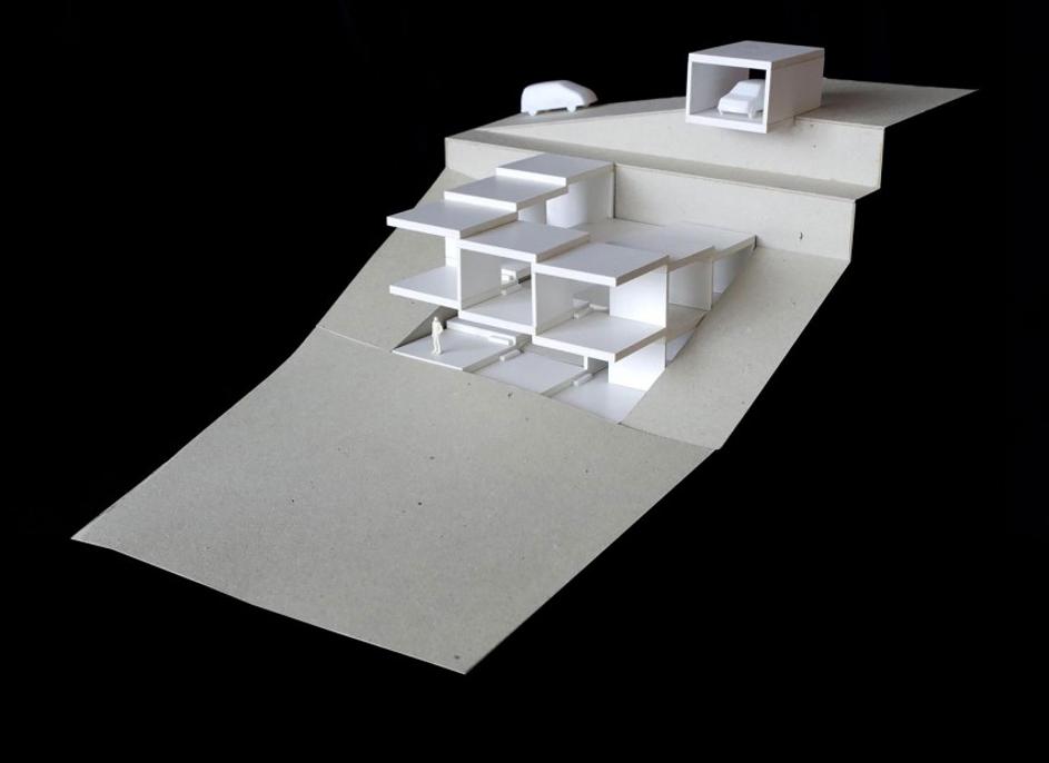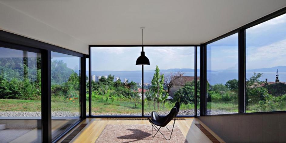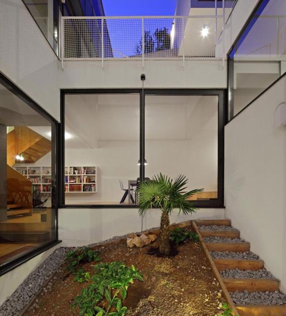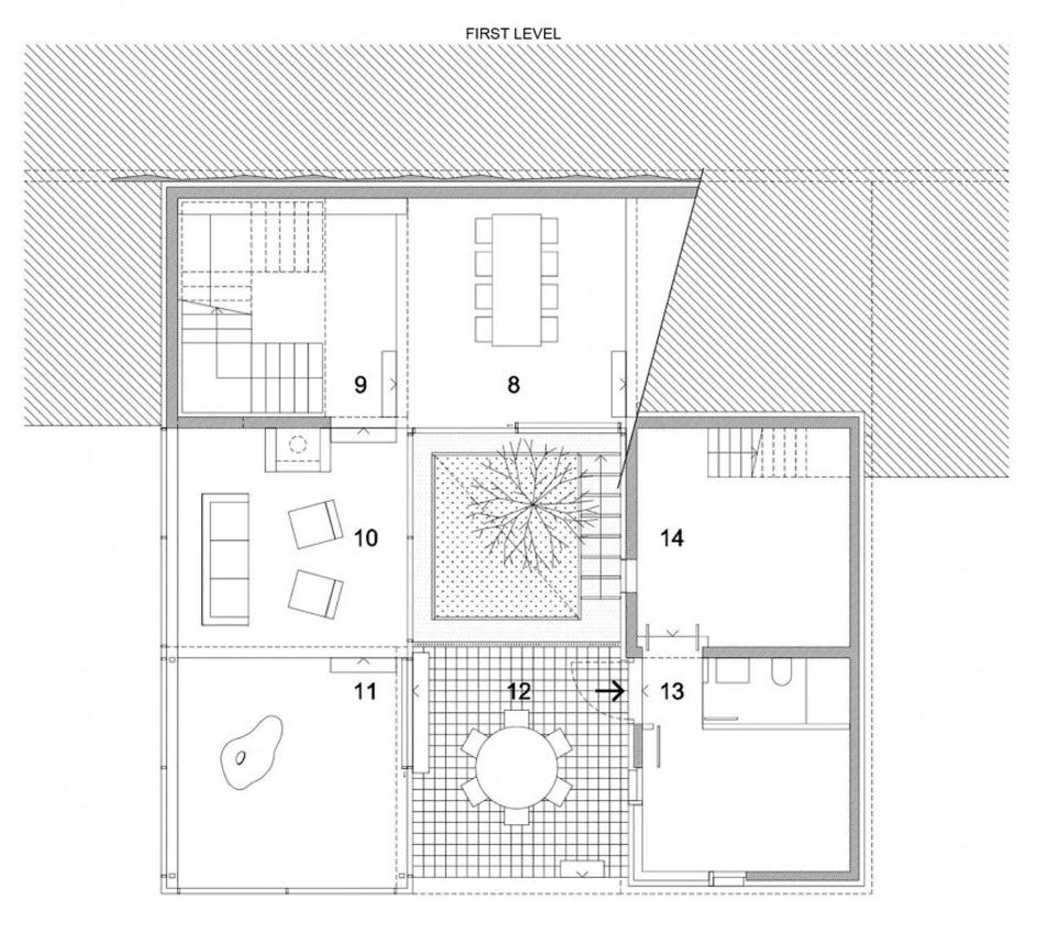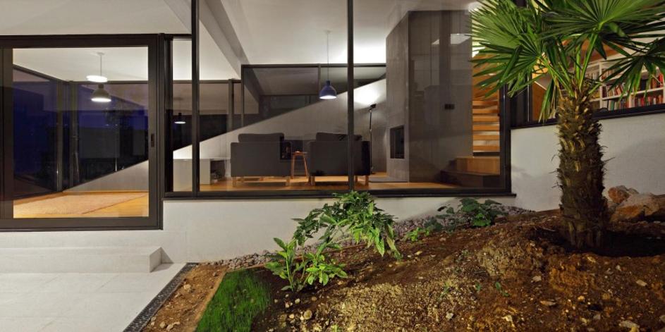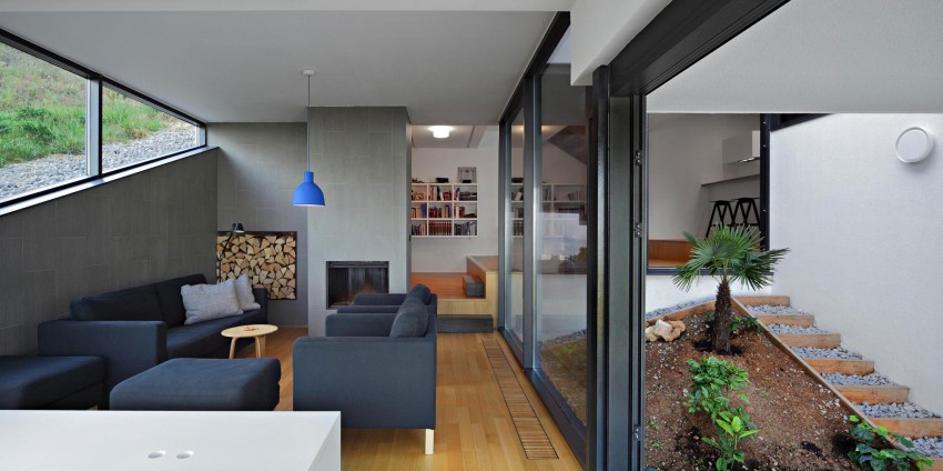 Hiša je v breg vsajena, zato je notranji atrij potreben, če želimo, da v vse prostore pride dovolj naravne svetlobe.