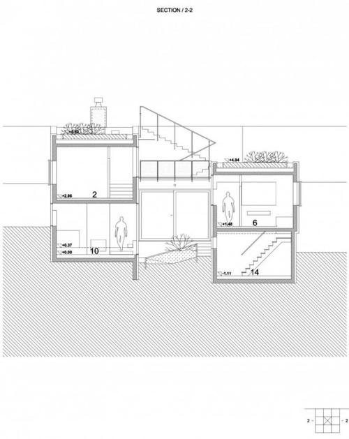 Objekt nima klasičnega pritličja in nadstropja, ampak je ustvarjena neprekinjena topografija prostorov.