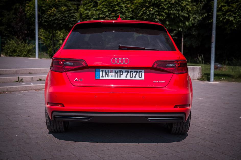 Audi A3 sportback Na zunaj in v potovalni kabini je veliko specifičnih elementov, ki dajejo vedeti, da gre za priključni hibrid, od logotipov e-tron, do drugačnih spojlerjev, športnejših odbijačev, izpušna cev ni vidna. Saša Despot Audi A3 sportback