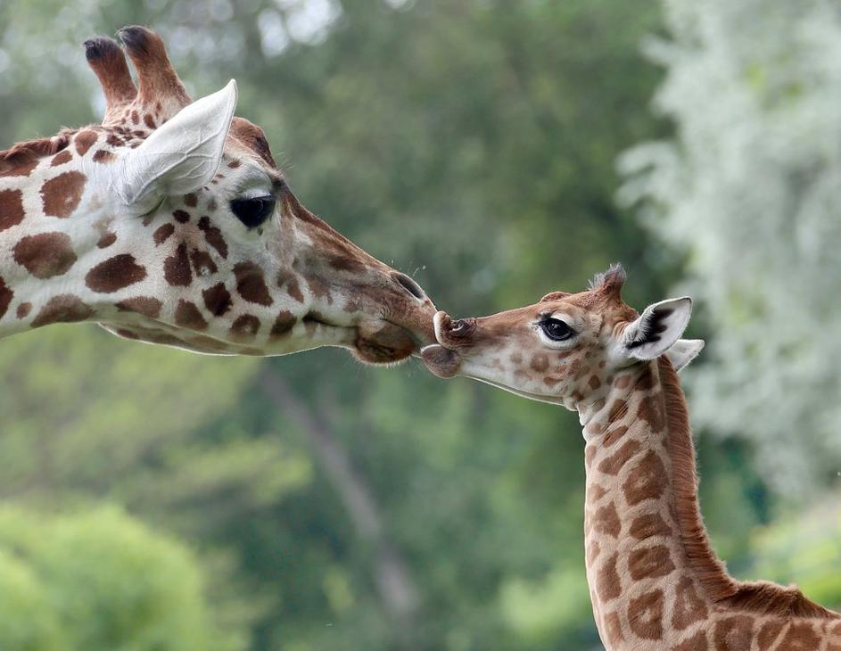 Žirafa lovi račko. Odrasla žirafa je sicer najvišja med vsemi kopenskimi živalskimi vrstami. Samci lahko dosežejo višino od 4,8 do 5,5 metra. EPA