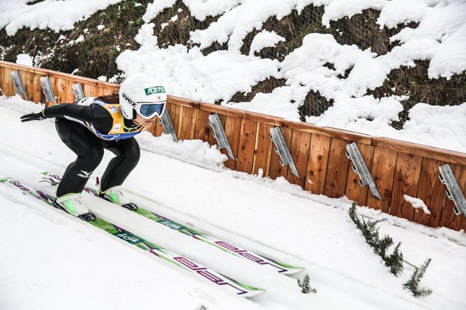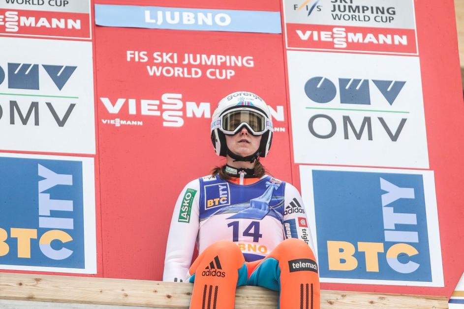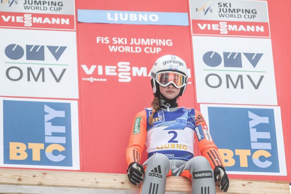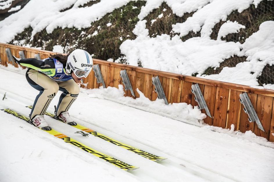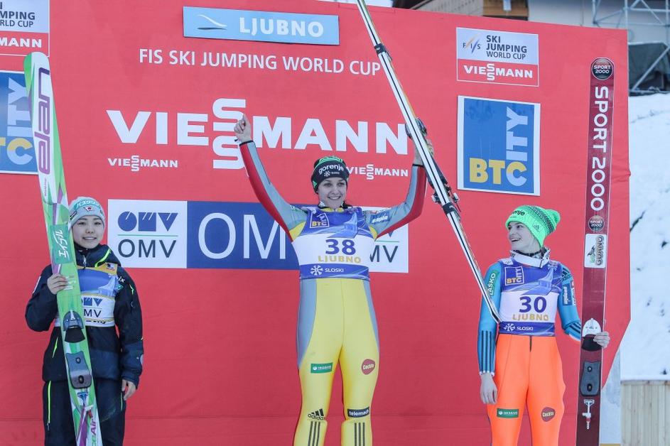 Maja Vtič (sredina) je poskrbela za drugo slovensko zmago v zgodovini ženskih smučarskih skokov.