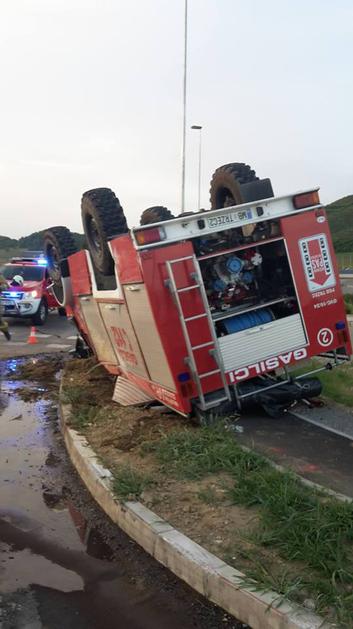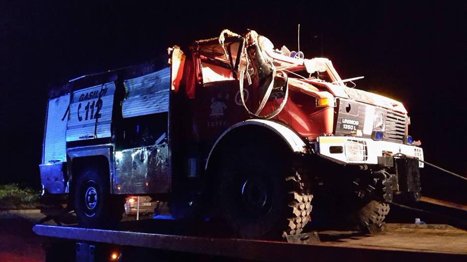 Gasilsko vozilo na strehi, poškodovano gasilsko vozilo