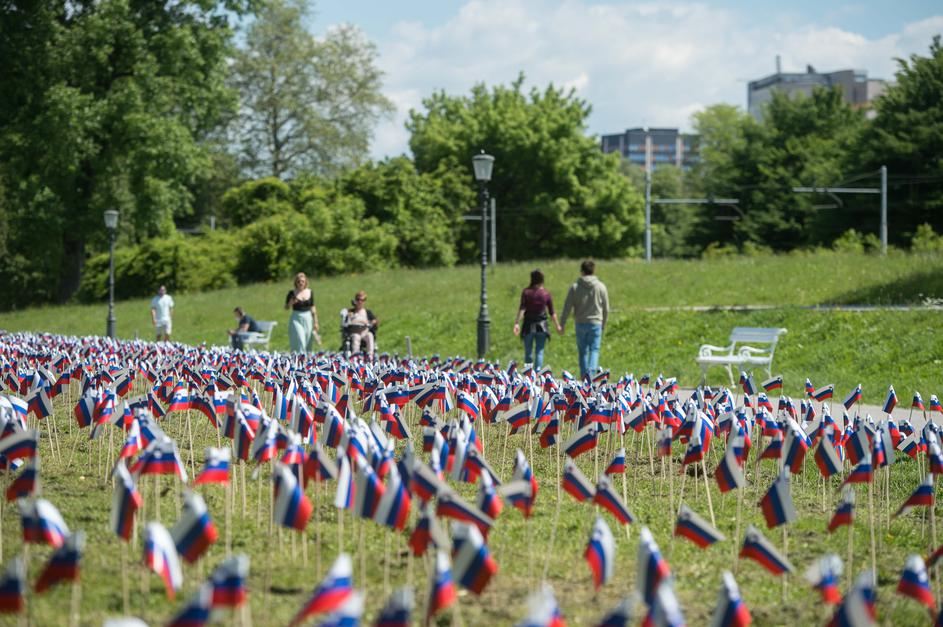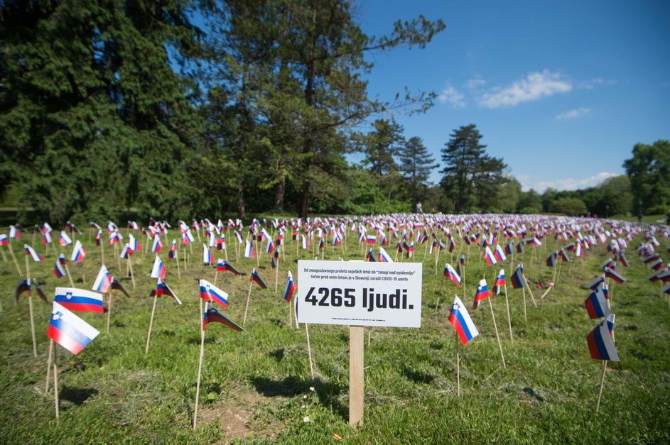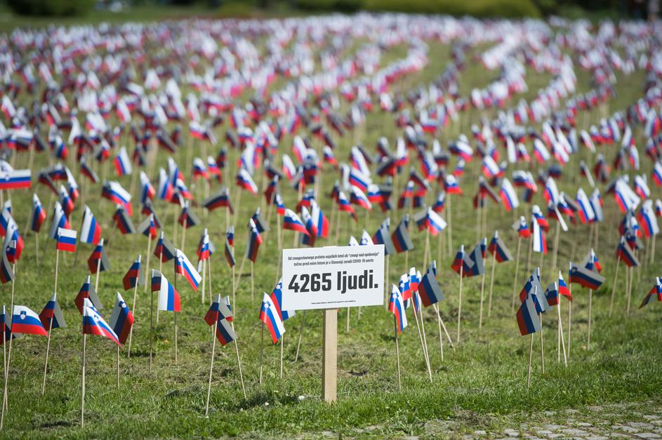V ljubljanskem parku Tivoli, na travniku ob promenadi, se je ponoči pojavilo 4265 slovenskih zastavic. Kot je razbrati iz postavljene table, zastavice predstavljajo 4265 ljudi, ki so v zadnjem letu umrli zaradi covida-19.