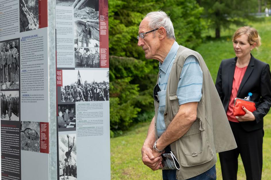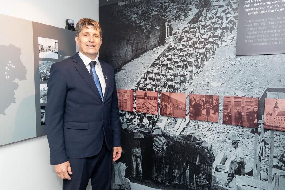 Tržiški župan mag. Borut Sajovic v nekdanji vojaški karavli pod Ljubeljem, v kateri je prenovljena razstava o koncentracijskem taborišču.