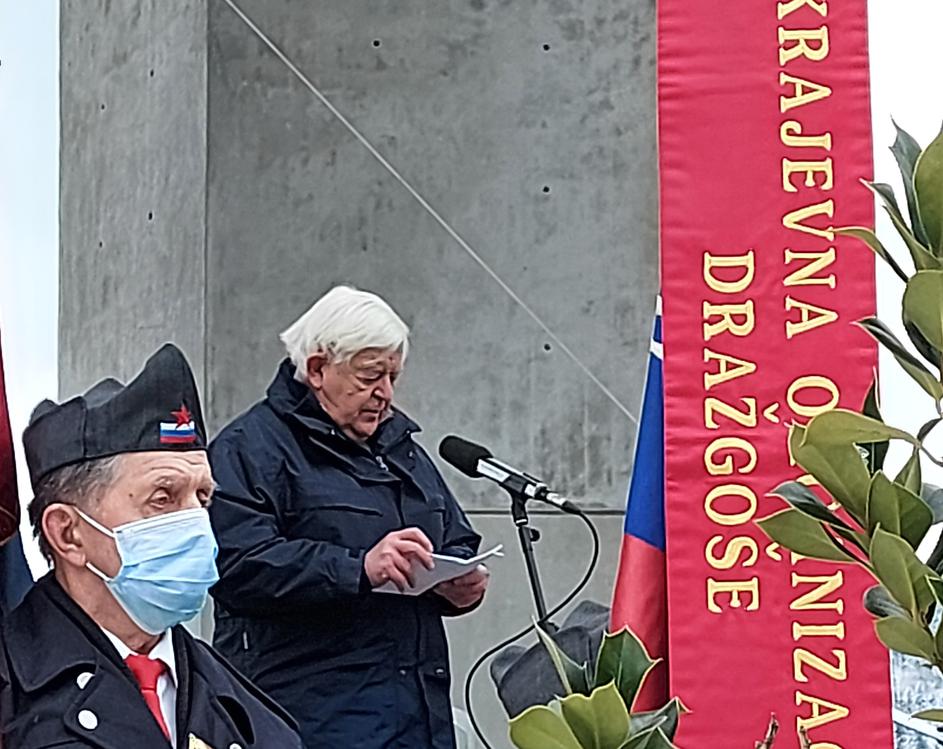 Prvi predsednik Republike Slovenije Milan Kučan med govorom 9. januarja 2022 v Dražgošah.