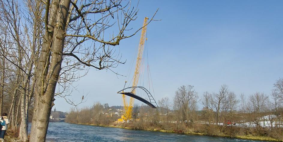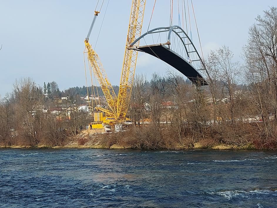 Dvigalo, kakršnega v Sloveniji bolj malokrat vidimo. Premik brvi čez reko Savo v Medvodah, posneto 2. februarja 2023.