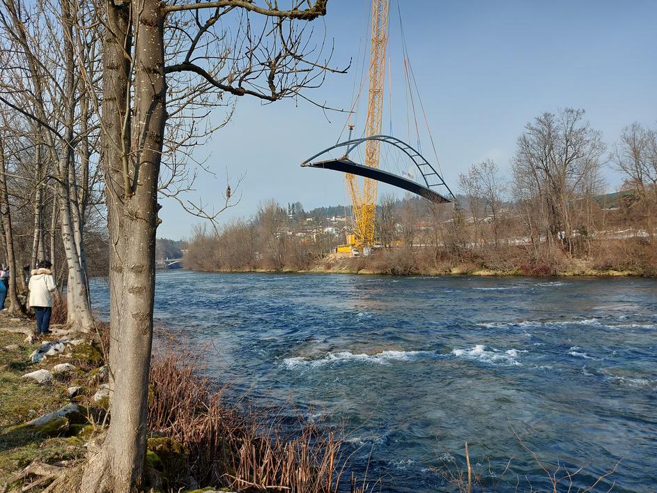 Premik brvi na reki Savi je jemal dih, posneto blizu sotočja Sore in Save v Medvodah, 2. februarja 2023.