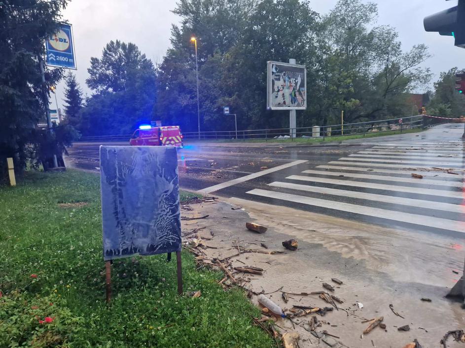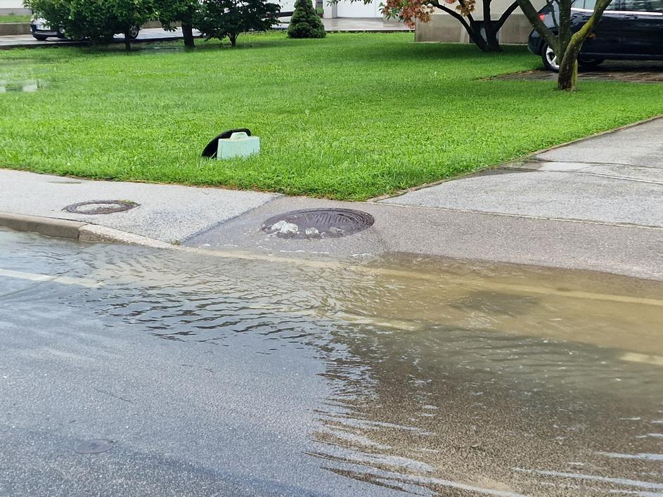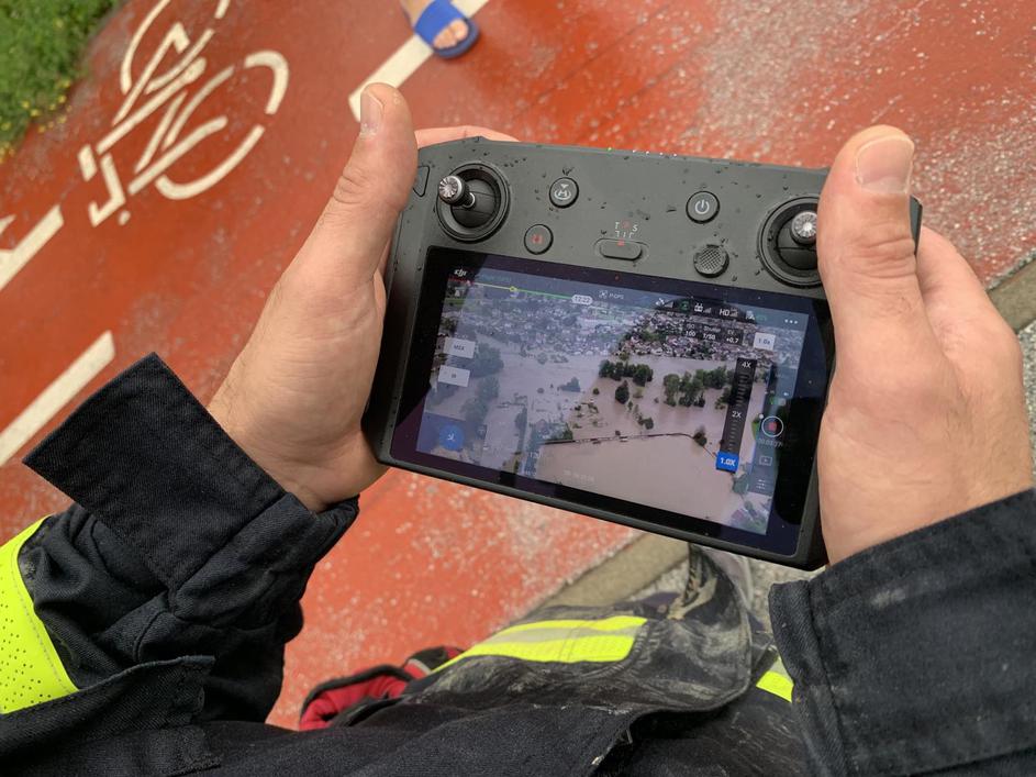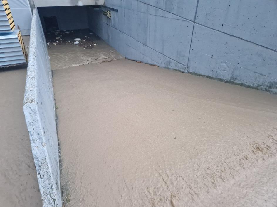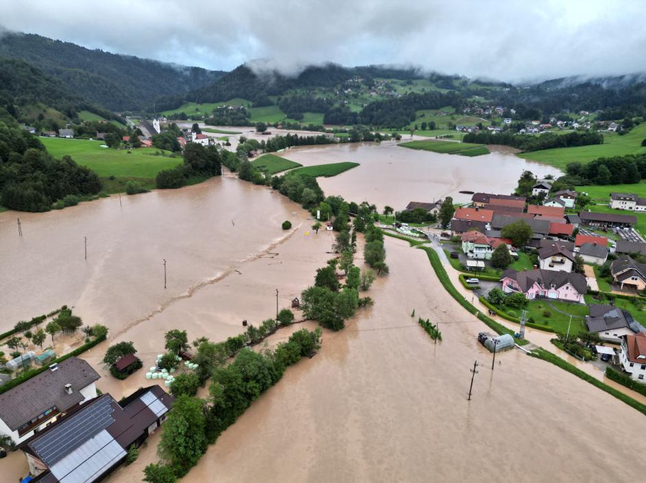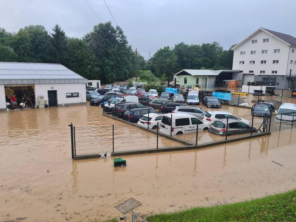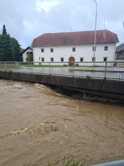 Kataklizmični prizor v Medvodah, posneto 4. avgusta 2023. Podivjani Sora in Sava sta danes zalili mesto.