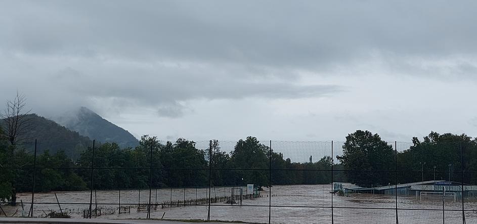 Kataklizmični prizor v Medvodah, posneto 4. avgusta 2023. Podivjani Sora in Sava sta danes zalili mesto.