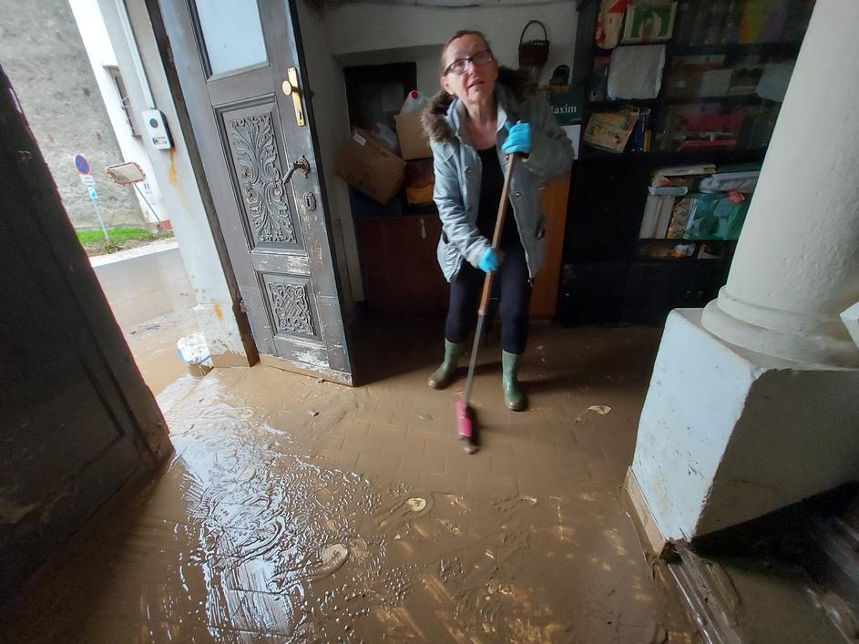 Čiščenje blata po poplavah v Medvodah
