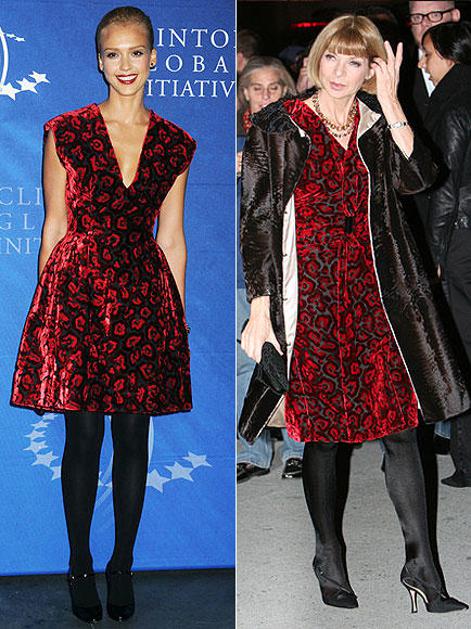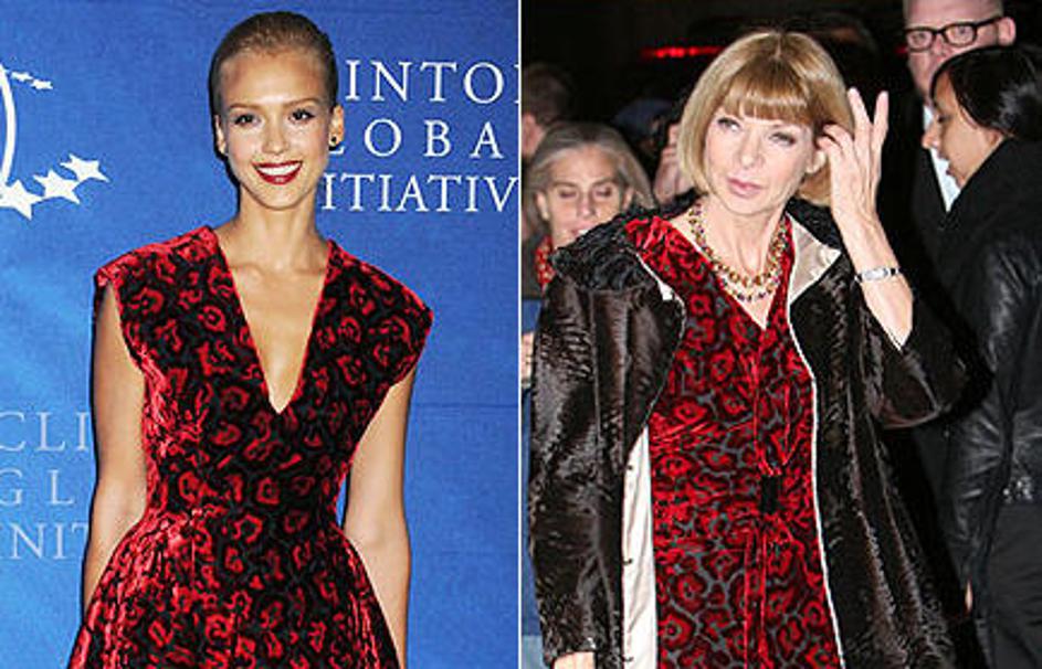 Jessica Alba vs. Anna Wintour: Sproščeno in urejeno. Všeč so nam zvončast kroj obleke, ozek pas, bar