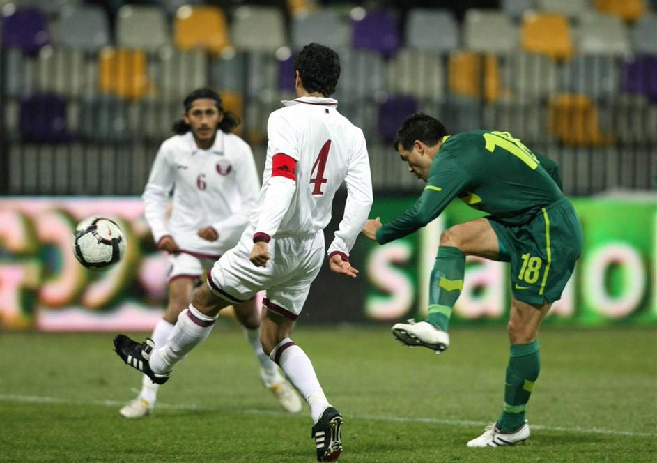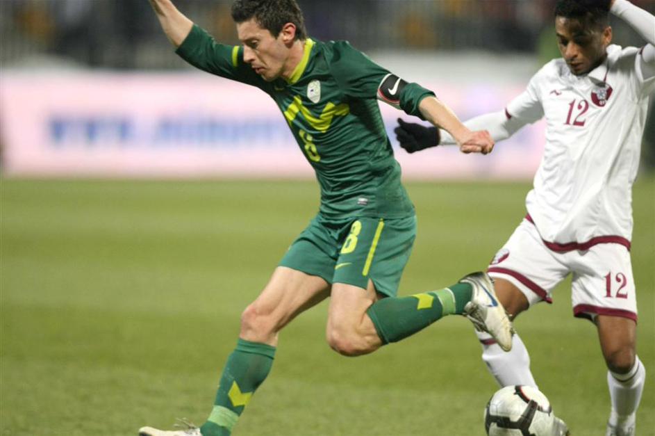 Radosavljević (desno) je z enim izmed strelov zatresel prečko katarskega vratarj