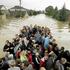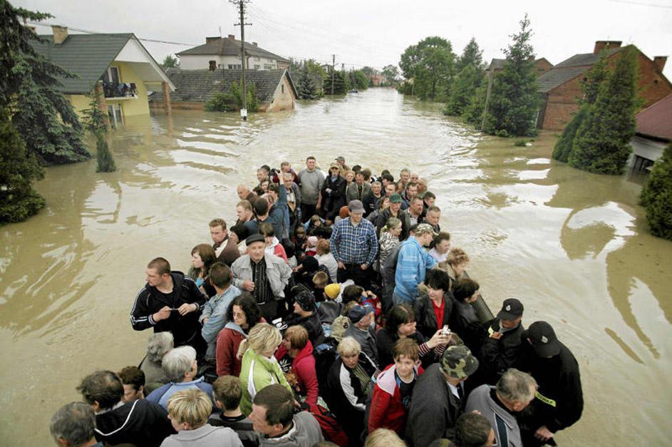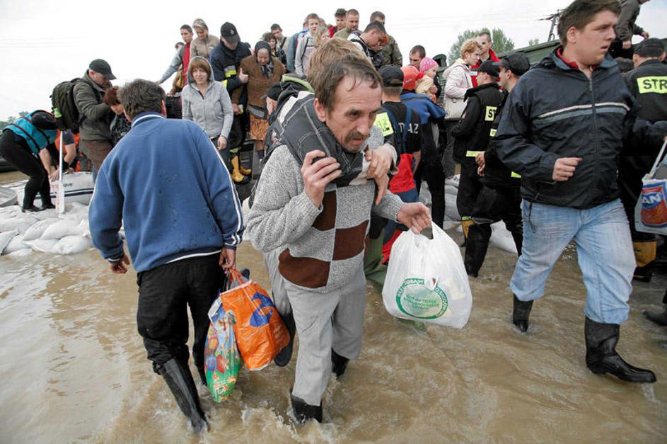 Moški nosi sina med evakuacijo iz poplavljenih naselij Trzesnic in Sokolniki.
