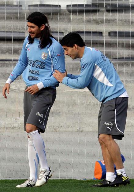 Luis Suarez (desno) je suspendiran, a se je vseeno malce pošalil s Sebastianom Abreuom.