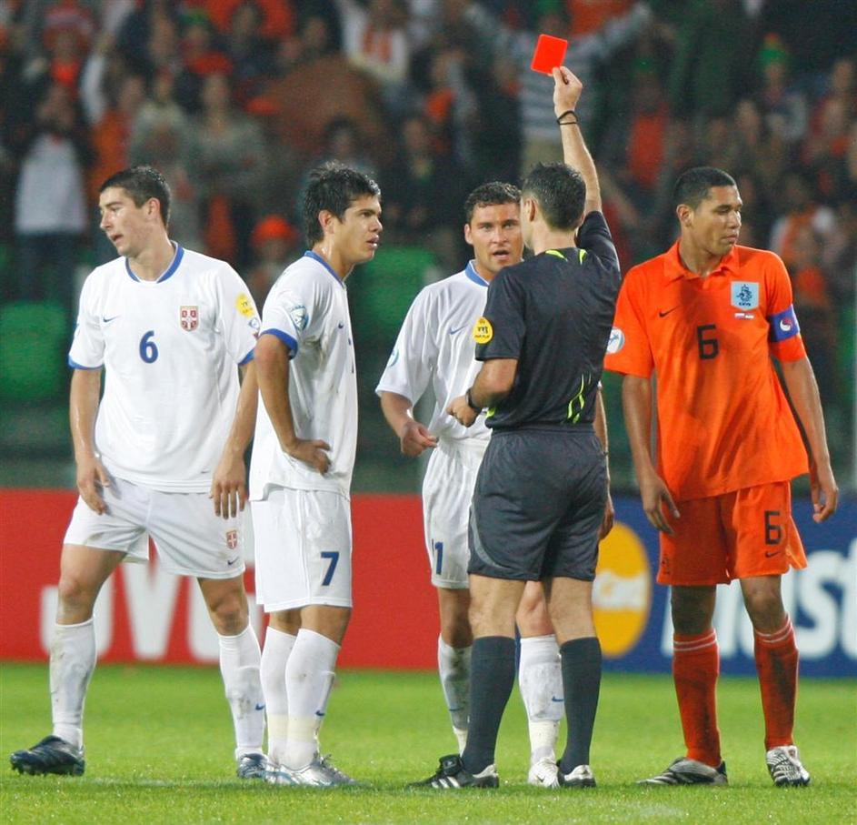 Skomina v finalu evropskega prvenstva do 21 let. Izključil je srbskega branilca Aleksandra Kolarova.