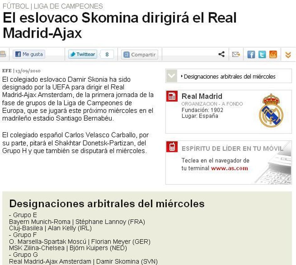 In še novica s spletne strani madridskega športnega dnevnika As. Naslov: Slovak Skomina bo sodil tek