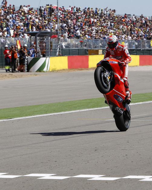 Stoner je ciljno črto prevozil le na zadnjem kolesu.