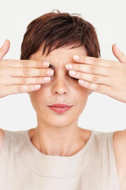 Zaprite oči, močno podrgnite dlan ob dlan. Dlani položite prek vek, a nanje ne pritiskate. Nazadnje