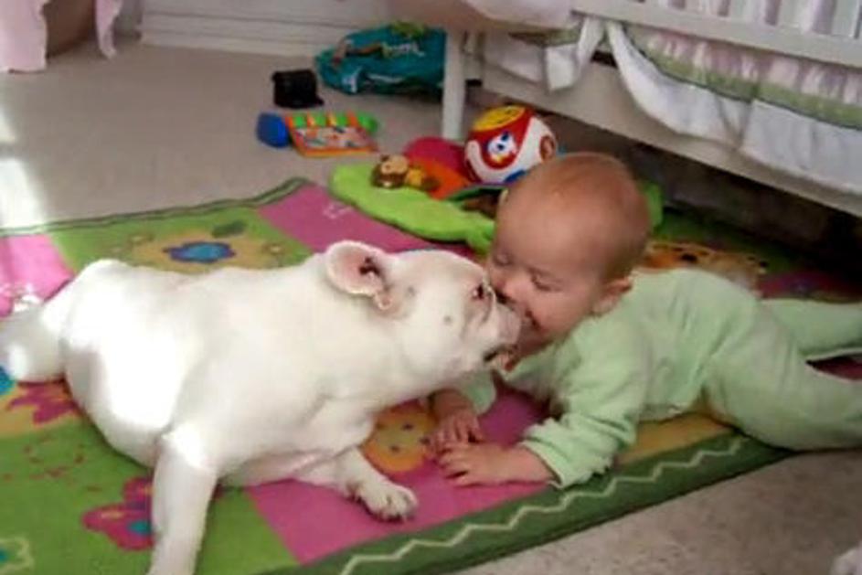 Psička uči plaziti dojenčico