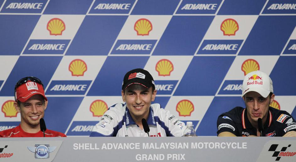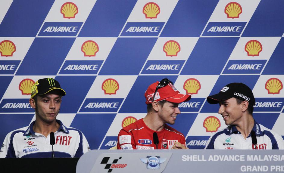 Avstralec Casey Stoner (v sredini) bo v Maleziji lovil tretjo zaporedno zmago.
