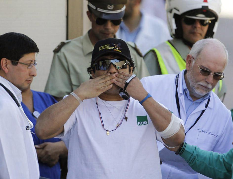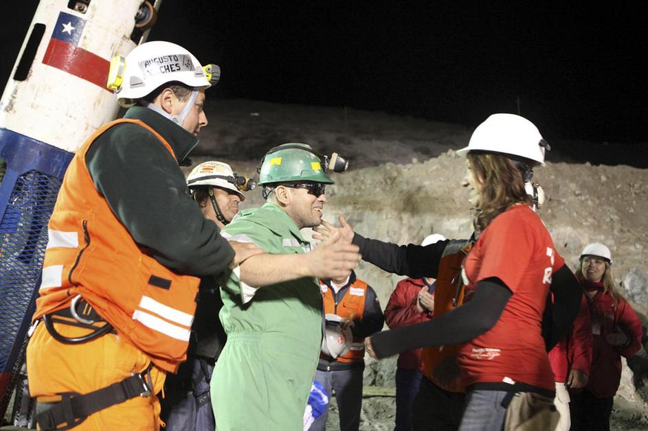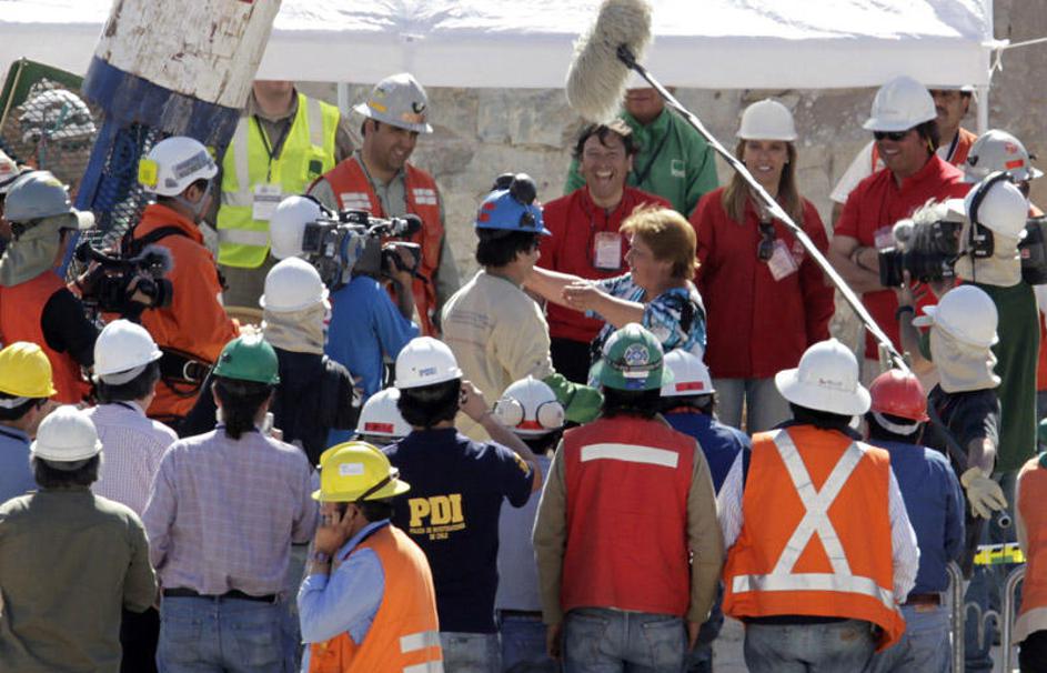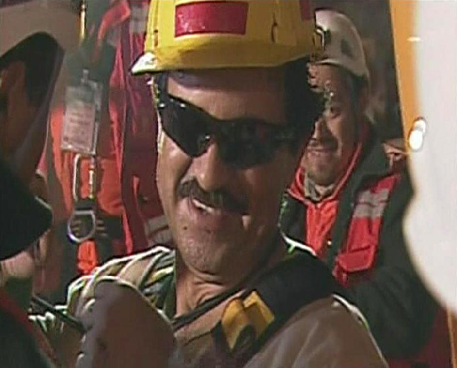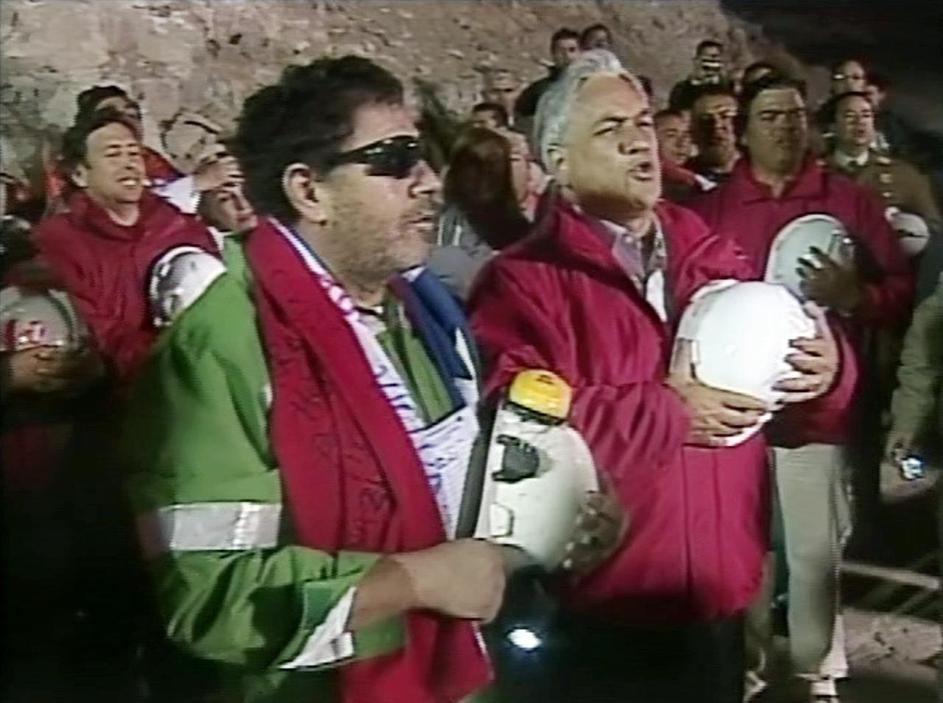 Levo vodja rudarjev pod zemljo Luis Uruza, desno čilski predsednik Pinera. Uruza