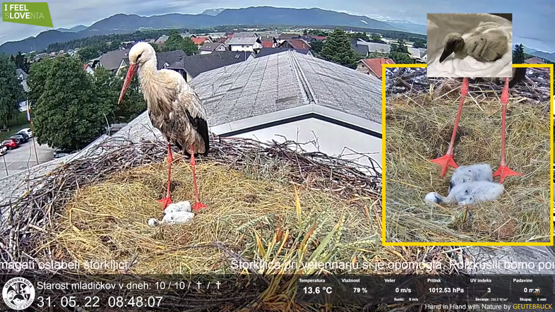 Kot smo že poročali, sta se tudi letos v gnezdo na dimniku Osnovne šole Predoslje tudi letos vrnil par štorkelj, ki jih lahko 24 ur na dan spremljamo TUKAJ. Samica je letos izlegla 5 jajc, iz štirih pa so se na koncu izvalile male štorkljice. Starša sta zanje dobro skrbela, a je zadnje močno poslabšanje vremena z nizkimi temperaturami poskrbelo za tragedijo.