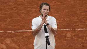 Šok v Parizu "Ne morem tukaj jokati. Nehajte. Pustite me na miru." Po senzacionalni zmagi se je zgrudil na hrbet in obležal na pesku z obrazom zakopanim v dlani, medtem ko so mu oči napo…